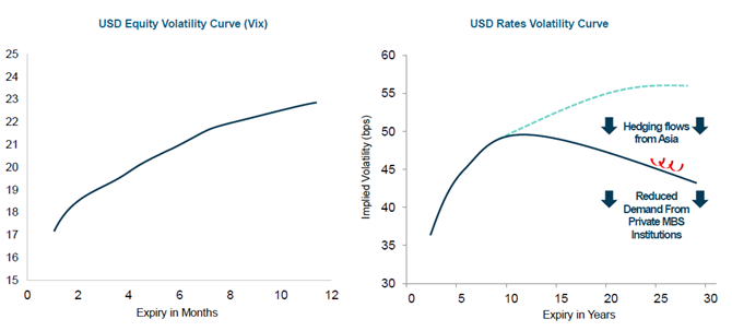 While ‘More sellers than buyers’ may be a pithy retort to explain why a price fell, it does illustrate that markets do not always price how they ‘should’ price. Traders care not for financial axioms, and flow will always dominate over reason. As such, nonsensical structural distortions can often materialise from time to time: yet these usually occur during times of stress, and are quickly priced out when calm returns. However, in the volatility markets, distortions are not only appearing but are persisting. A case in point is the US rates vol market. The two curves below illustrate the general shape of the US equity and rates volatility curves.