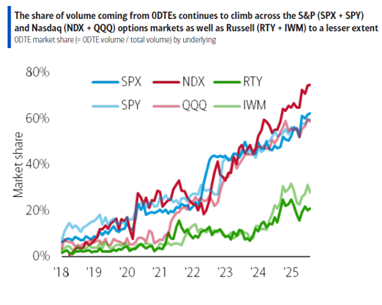 But this time, rather than a balance sheet bloated central bank weighing down the vol curve, enter stage the new protagonist – the zero-day option market.
