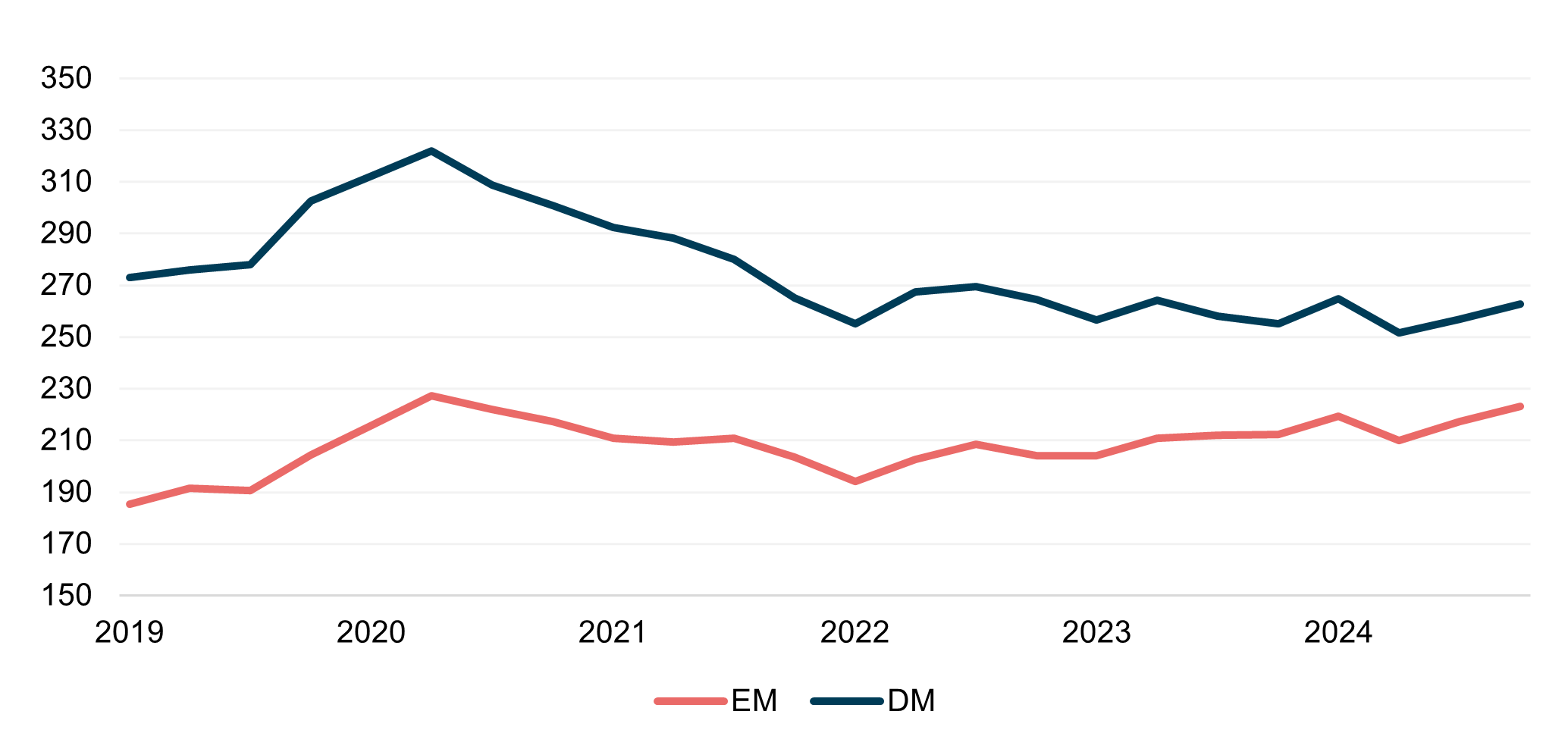 This way of analysing sovereign debt finances is the only way we can reconcile such discrepancies, as EM countries, which, on average, have much less debt than DM countries, trade at much wider premiums to DM ones. When it comes to fiscal headroom, the more sovereign the country is, the more debt it can take, no questions asked.